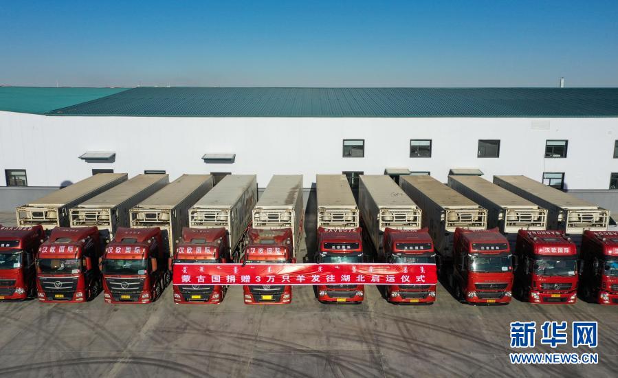 11月12日上午,首批加工完毕的1.2万只蒙古国捐赠羊完成装车,随即从内蒙古自治区二连浩特市启程,前往湖北省武汉市。新华社记者 刘磊 摄