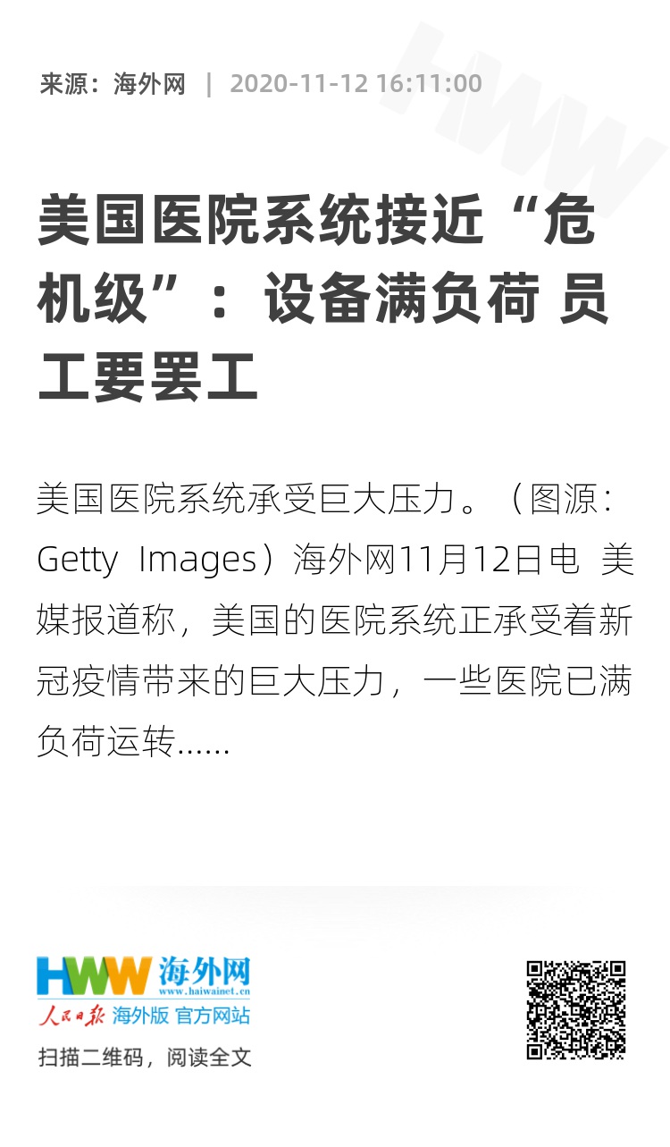 海外网11月12日电 美媒报道称,美国的医院系统正承受着新冠疫情带来的巨大压力,一些医院已满负荷运转,而另一些医院则面临员工罢工的威胁。