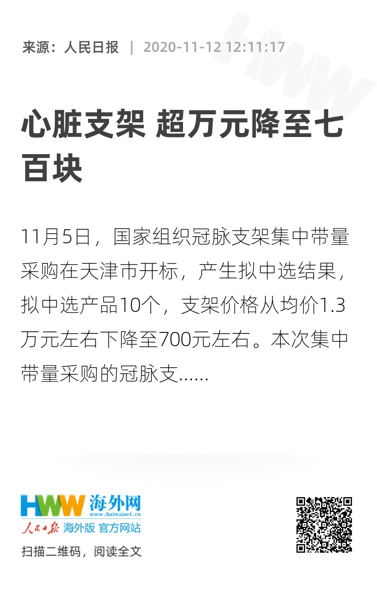 11月5日,国家组织冠脉支架集中带量采购在天津市开标,产生拟中选结果,拟中选产品10个,支架价格从均价1.3万元左右下降至700元左右。本次集中带量采购的冠脉支架材质为钴铬合金或铂铬合金,载药种类为雷帕霉素及其衍生物,采购周期为两年。预计全国患者将于2021年1月用上国家集采降价后的中选产品。