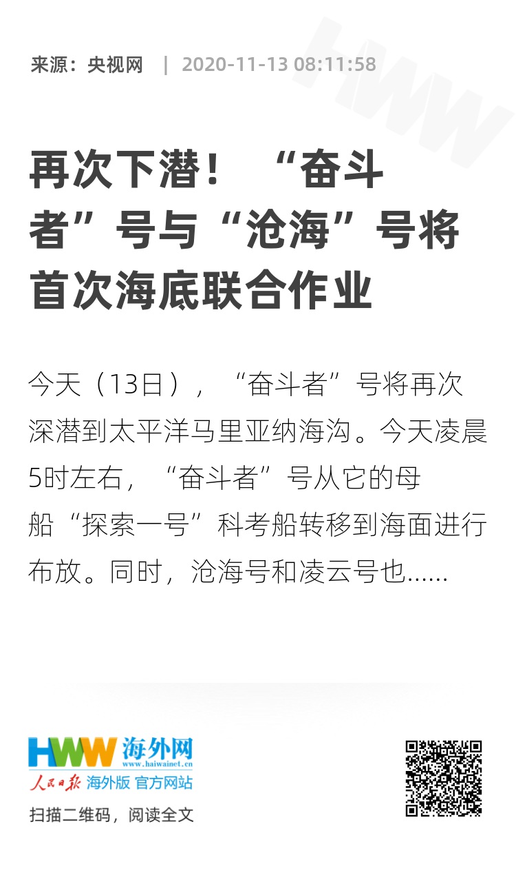 今天(13日),“奋斗者”号将再次深潜到太平洋马里亚纳海沟。今天凌晨5时左右,“奋斗者”号从它的母船“探索一号”科考船转移到海面进行布放。同时,沧海号和凌云号也从“探索二号”保障船上顺利布放。