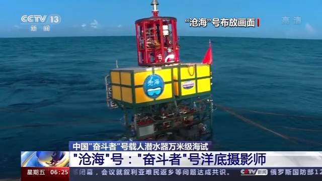 “沧海号"是一台全球独家的深海着陆器,可以进行全海深4K超高清视频 拍摄采集、传输处理;不仅可以搭载全海深高清相机将万米洋底的实时画面直播回传,而且还能记录深海中“奋斗者"号的一举一动。它的小助理“凌云号”在海底可以自由活动,提供更多角度的照明,这也为“奋斗者"号的洋底作业提供了独家的第二机位。形象来说,“沧海"号和"凌云"号,它们是给“奋斗者”号在万米洋底“打光拍照"的"御用摄影师"。透过它们提供的信号,我们将一起直击探洋作业第一现场,共同见证"奋斗者"号与"沧海"号首次海底联合作业的最新进展。