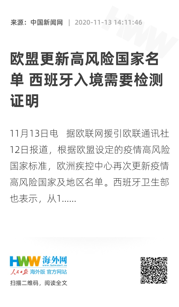 中新网11月13日电 据欧联网援引欧联通讯社12日报道,根据欧盟设定的疫情高风险国家标准,欧洲疾控中心再次更新疫情高风险国家及地区名单。西班牙卫生部也表示,从11月23日起,疫情高风险国家旅客入境西班牙,必须提交新冠病毒检测结果呈阴性的证明。