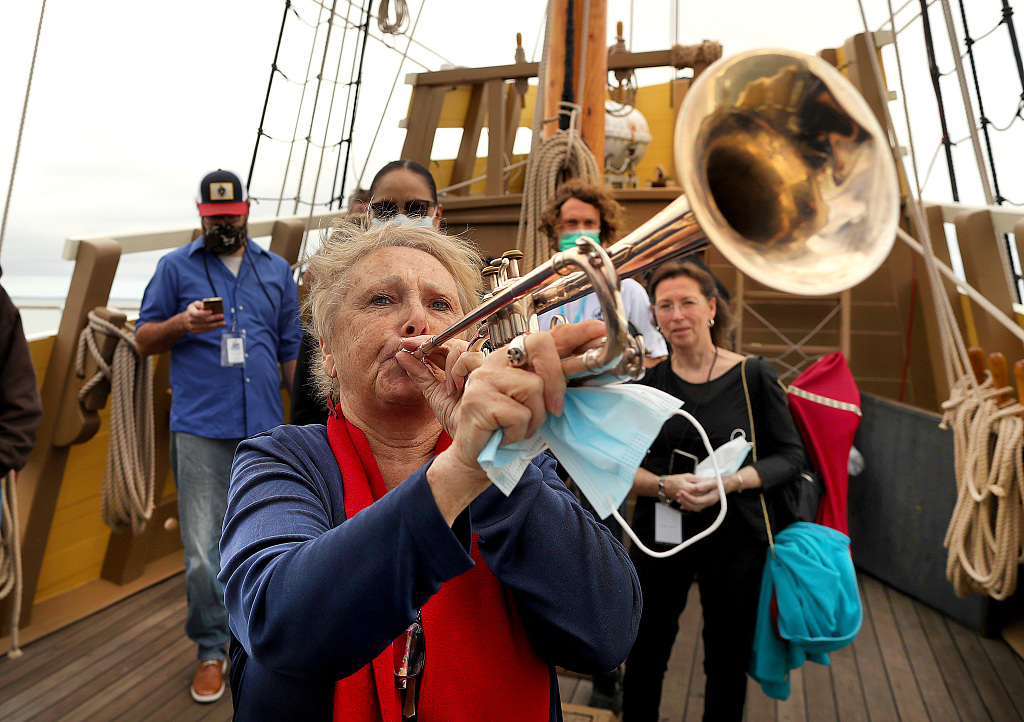 当地时间2020年11月11日,美国马萨诸塞州普利茅斯,1620年的11月11日,整整400年前,“五月花号”抵达科德角的普罗温斯敦。周三,数百名游客和朝圣者的一些后裔来到“五月花号”轮船,纪念登陆400周年。图片来源:视觉中国
