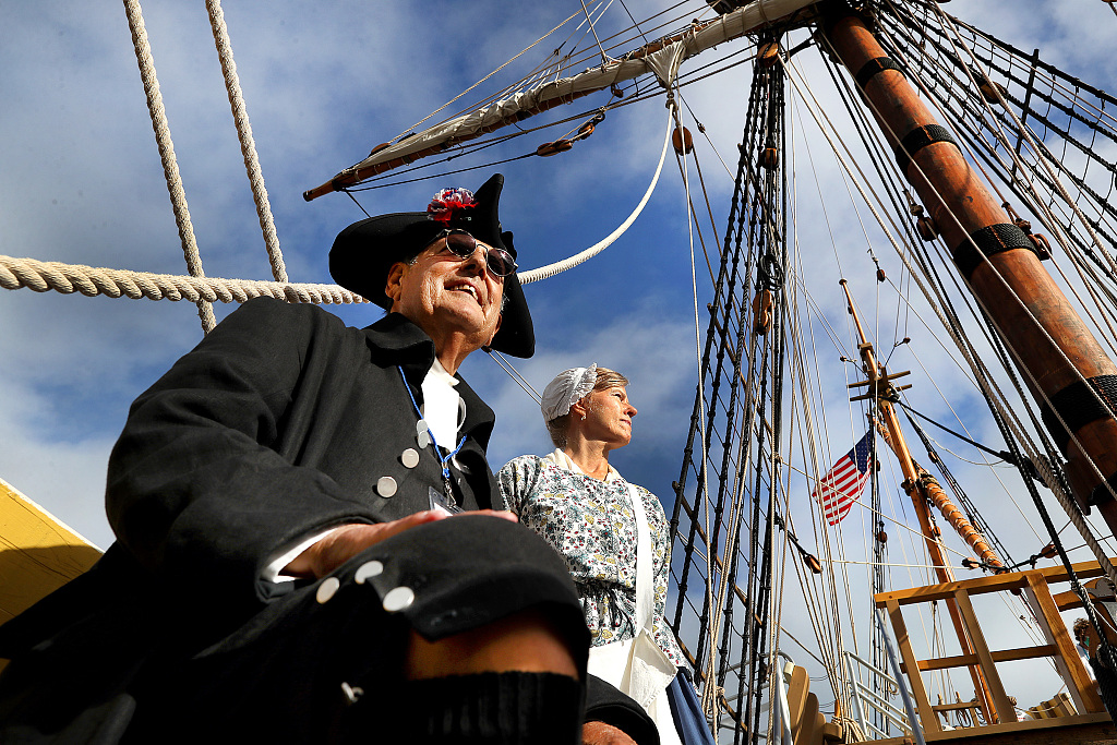 当地时间2020年11月11日,美国马萨诸塞州普利茅斯,1620年的11月11日,整整400年前,“五月花号”抵达科德角的普罗温斯敦。周三,数百名游客和朝圣者的一些后裔来到“五月花号”轮船,纪念登陆400周年。图片来源:视觉中国