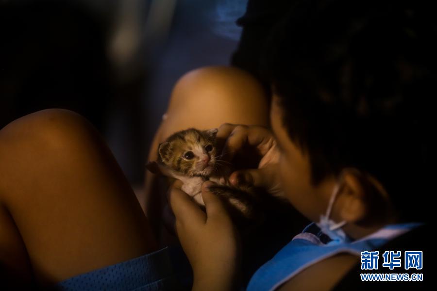 11月12日,在菲律宾奎松城的一处安置点,一名男孩和小猫玩耍。新华社发(乌马利摄)