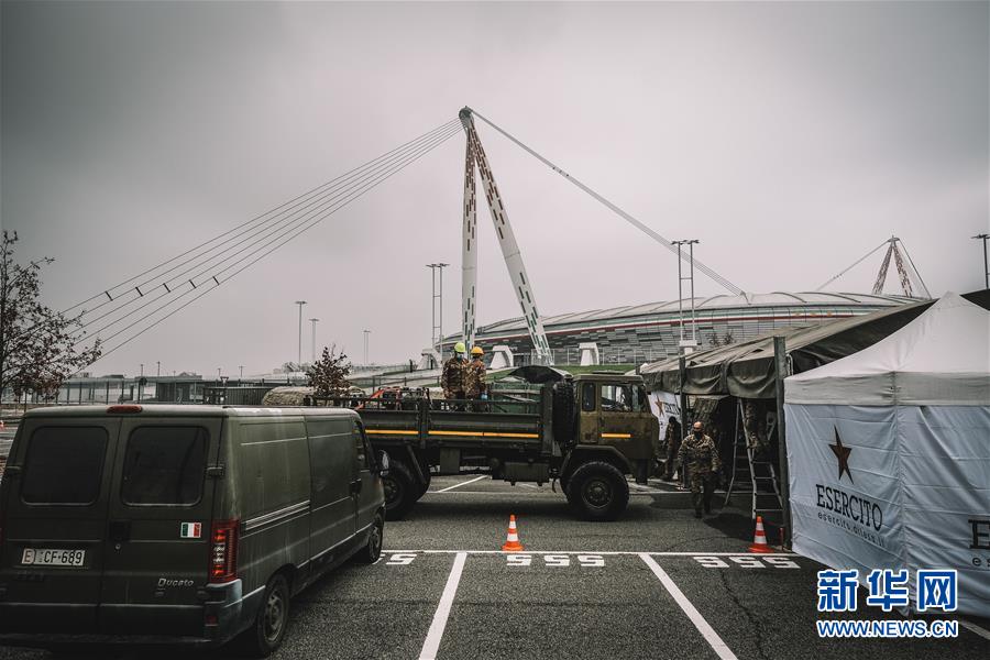 11月12日,意大利陆军士兵在都灵搭建新冠快速检测点。 意大利陆军正在都灵的尤文图斯安联体育场外搭建一处新冠快速检测点,计划实现每日约1000次的免下车检测,将最早于13日投入使用。都灵所在的皮埃蒙特大区是意大利新冠肺炎疫情最严重的几个大区之一。 新华社发(塔尔迪托 摄)