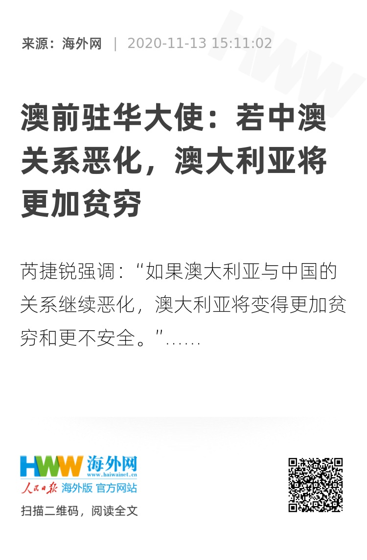 芮捷锐强调:“对澳大利亚而言,至关重要的是一个强大且充满活力的经济环境。如果澳大利亚与中国的关系继续恶化,澳大利亚将变得更加贫穷和更不安全。” 2007年至2011年,芮捷锐曾担任澳大利亚驻华大使,目前在一家煤炭公司任职董事,同时也是报纸专栏作家。(海外网 朱惠悦)