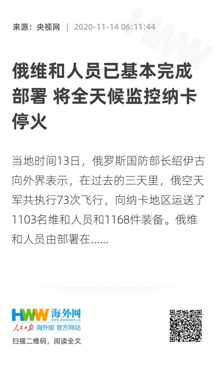 绍伊古介绍,俄军维和人员本月10日到11日控制纳卡地区拉钦走廊一线,13日晚进入纳卡首府斯捷潘纳克特,已在斯捷潘纳克特、舒沙和南部责任区设置维和观察站,14日开始将在纳卡地区设置另外8个维和观察站。