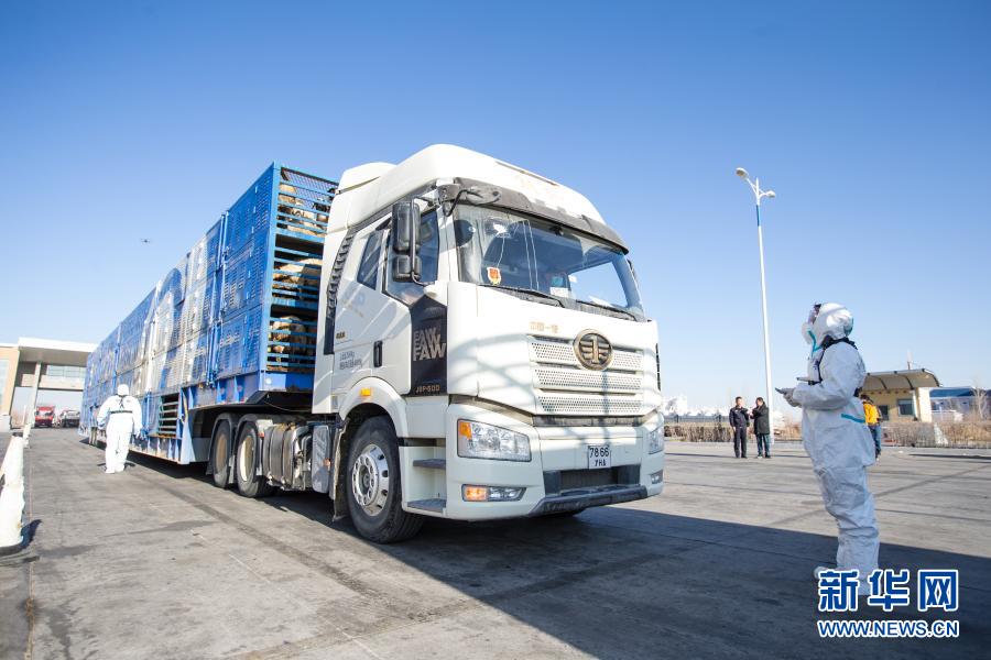 11月13日,内蒙古出入境边防检查总站二连出入境边防检查站执勤民警对载羊车辆进行车体检查。新华社发(郭鹏杰 摄)