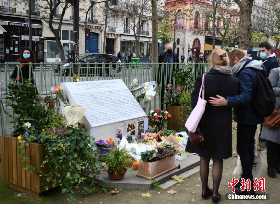 2020年11月13日是巴黎恐怖袭击五周年,民众在巴黎巴塔克兰剧院附近为遇难者设立的纪念碑前悼念。2015年11月13日的巴黎恐怖袭击造成130人死亡,其中有90人死于巴塔克兰剧院。 中新社记者 李洋 摄