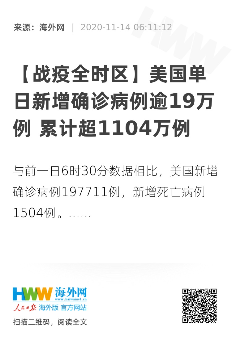 海外网11月14日电 根据Worldometer实时统计数据,截至北京时间11月14日6时30分左右,美国累计确诊新冠肺炎病例11041227例,累计死亡249789例。与前一日6时30分数据相比,美国新增确诊病例197711例,新增死亡病例1504例。