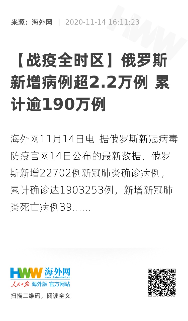 31916794,.【战疫全时区】俄罗斯新增病例超2.2万例 累计逾190万例,.2020-11-14 16:14:23,.204521,.汪晓宇、朱惠悦