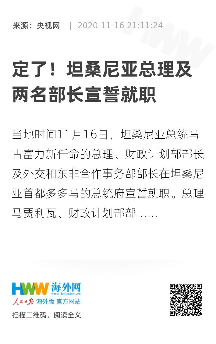 当地时间11月16日,坦桑尼亚总统马古富力新任命的总理、财政计划部部长及外交和东非合作事务部部长在坦桑尼亚首都多多马的总统府宣誓就职。总理马贾利瓦、财政计划部部长姆潘戈、外交和东非合作事务部部长卡布迪将继续担任相关职位。桑给巴尔总统姆维尼,坦桑尼亚副总统萨米亚·哈桑,各地区行政长官及议会议员等也出席了活动。