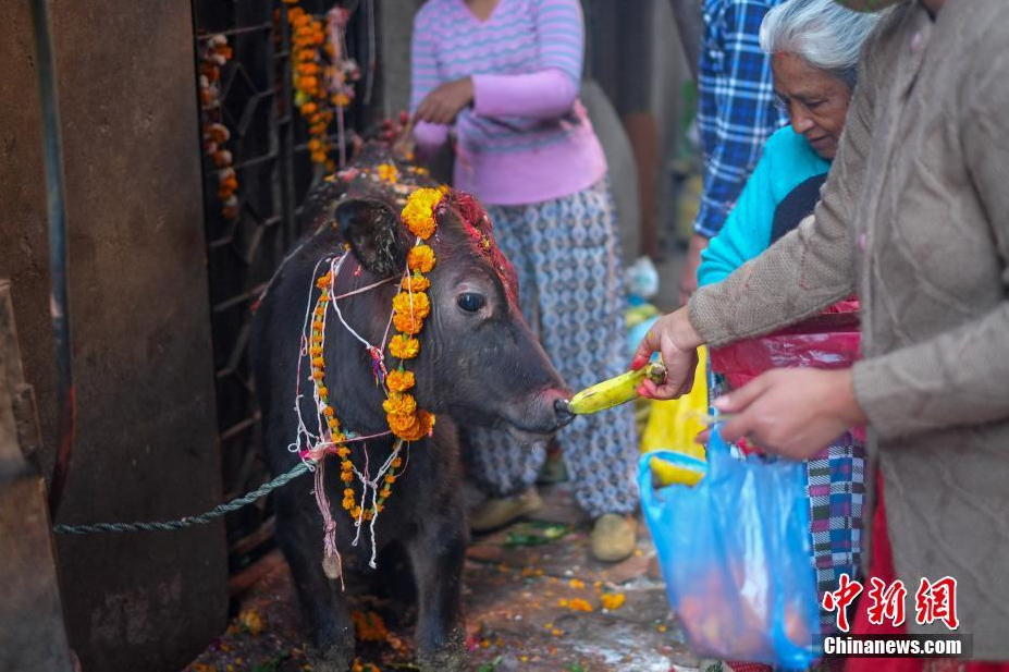 11月15日,尼泊尔首都加德满都地区一位妇人给戴花环的牛喂食香蕉。当天是尼泊尔灯节的第三天,在这一天,当地民众根据习俗要为牛戴上万寿菊花环、绑上各类丝带、投喂美食。 中新社发 普拉丹 摄