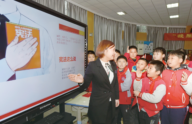 坚持依法治国首先要坚持依宪治国,要全面贯彻实施宪法,必须在全社会深入开展尊崇宪法、学习宪法、遵守宪法、维护宪法、运用宪法宣传教育活动,弘扬宪法精神,加强宪法实施和监督。图为2018年12月3日,安徽省合肥市经开区明珠居委会法律援助律师在给明珠小学的学生们讲解宪法知识。 新华社记者 郭晨/摄