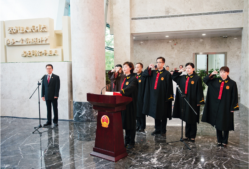 2017年8月18日,全国首家互联网法院在杭州成立。该法院定位于用互联网方式审理互联网案件,当事人通过互联网,足不出户就能完成诉讼,实现“网上纠纷网上了”。图为互联网法院成立当日,法官们参加宪法宣誓仪式。 新华社记者 翁忻旸/摄