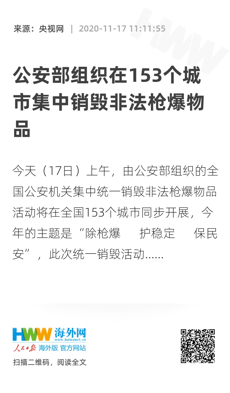 今天全国公安机关集中安全销毁的共有6.9万支枪支,记者此前了解到,2018年的时候全国销毁的非法枪支的数量大约有14万多支,2019年是10.7万支,今年则是6.9万。还有一组数字要特别说明,今年1至10月持枪犯罪同比下降13.3%,爆炸犯罪同比下降19.2%。这些显著下降的数字,就能充分说明这三年来缉枪治爆的显著成效。