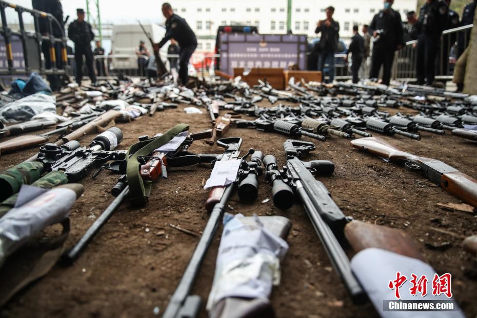 11月17日,在2020年中国公安机关集中统一销毁非法枪爆物品活动贵州省贵阳市现场,堆放着贵州警方收缴的非法枪支。 中新社记者 瞿宏伦 摄