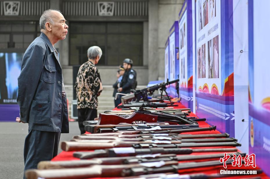 11月17日,广东省韶关市,广东警方在韶关钢铁厂展示涉案枪支。当日,广东警方集中统一销毁非法枪爆物品活动在韶关钢铁厂举行。 中新社记者 陈骥旻 摄