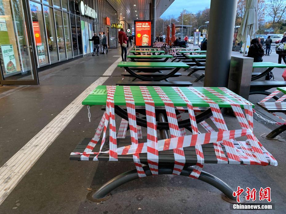 11月16日,德国总理默克尔与各州州长会谈后,未如外界此前所预期地推出更为严厉的防疫措施,而是维持当前的“封城”措施力度。默克尔当天呼吁国民将人际接触缩减到尽可能小的程度,认真遵守政府倡导的防疫规则。德国政府同一天宣布,将从12月起向高危人群每人发放15个FFP2(即N95)口罩。图为16日下午,柏林健康泉车站外贴满胶带的露天餐桌。本轮“封城”期间,德国餐饮业被禁止提供堂食。 中新社记者 彭大伟 摄