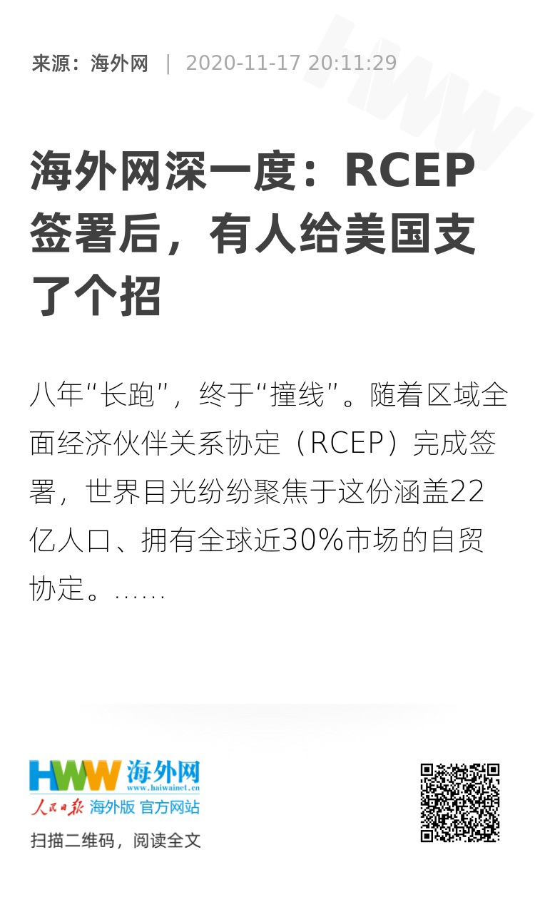值得注意的是,RCEP的签署是在美国退出“重塑国际关系的全面贸易协议”的背景下完成的。美国智库亚洲协会政策研究所发文称,“RCEP的签署再次提醒我们,在没有美国参与的情况下,我们的亚洲贸易伙伴已经建立了合作的信心。分析人士指出,“美国不应该将中国视为敌人,而应该当作和平与繁荣的贡献者。”