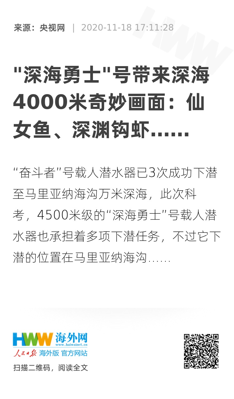 今天(18日),“深海勇士”号进行第297次下潜,这也是本次载人深潜科考“深海勇士”号的第四次下潜。到达太平洋后,“深海勇士”号已经进行了三次下潜,今天的下潜任务完成度如何?依靠携带的照相、摄像设备,“深海勇士”号带回了大量珍贵照片和视频。4000多米的深海是什么样?有什么生物?