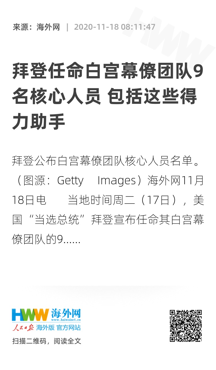 海外网11月18日电 当地时间周二(17日),美国“当选总统”拜登宣布任命其白宫幕僚团队的9名核心成员。