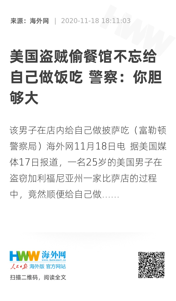 海外网11月18日电 据美国媒体17日报道,一名25岁的美国男子在盗窃加利福尼亚州一家比萨店的过程中,竟然顺便给自己做了一顿饭吃。警方对此直言,“胆子真够大的”。