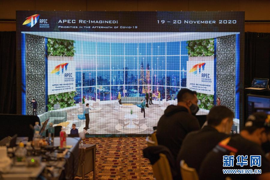 11月18日,在马来西亚吉隆坡会议中心,工作人员在亚太经合组织工商领导人对话会指挥中心忙碌。2020年亚太经合组织(APEC)工商领导人对话会19日以线上形式举行,对话会指挥中心发挥了技术保障的“中枢”作用,确保了线上对话会顺利举行。马来西亚是2020年APEC会议东道主。新华社记者 朱炜 摄