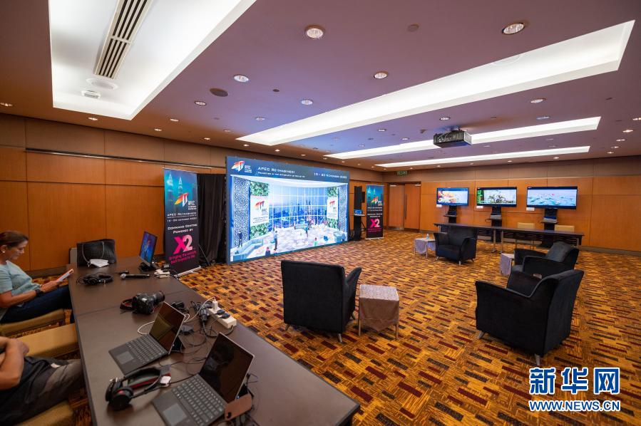这是11月18日在马来西亚吉隆坡会议中心拍摄的亚太经合组织工商领导人对话会指挥中心。2020年亚太经合组织(APEC)工商领导人对话会19日以线上形式举行,对话会指挥中心发挥了技术保障的“中枢”作用,确保了线上对话会顺利举行。马来西亚是2020年APEC会议东道主。新华社记者 朱炜 摄