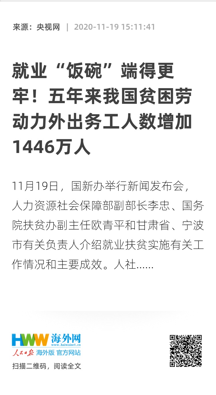 11月19日,国新办举行新闻发布会,人力资源社会保障部副部长李忠、国务院扶贫办副主任欧青平和甘肃省、宁波市有关负责人介绍就业扶贫实施有关工作情况和主要成效。人社部副部长李忠介绍,经过5年的努力,我国通过拓宽就业渠道、加大政策扶持、加强就业服务、强化职业培训等举措,就业扶贫取得显著成效。