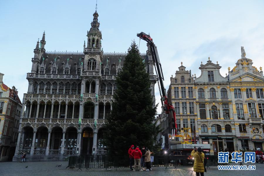 这是11月19日在比利时布鲁塞尔大广场拍摄的圣诞树安装现场。今年的比利时布鲁塞尔大广场上的圣诞树来自于比利时瓦隆大区,是一棵18米高的高加索冷杉,它的装饰元素主题将是“更新”。比利时目前正处于新冠疫情防控措施实施过程中,其中包括取消圣诞市场。新华社记者郑焕松摄