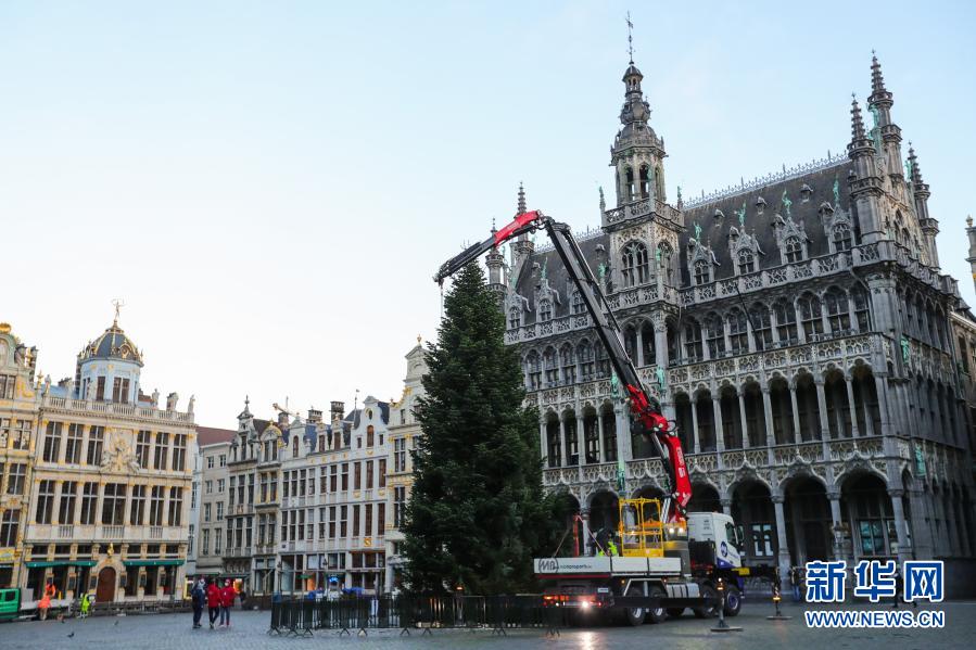 这是11月19日在比利时布鲁塞尔大广场拍摄的圣诞树安装现场。今年的比利时布鲁塞尔大广场上的圣诞树来自于比利时瓦隆大区,是一棵18米高的高加索冷杉,它的装饰元素主题将是“更新”。比利时目前正处于新冠疫情防控措施实施过程中,其中包括取消圣诞市场。新华社记者郑焕松摄