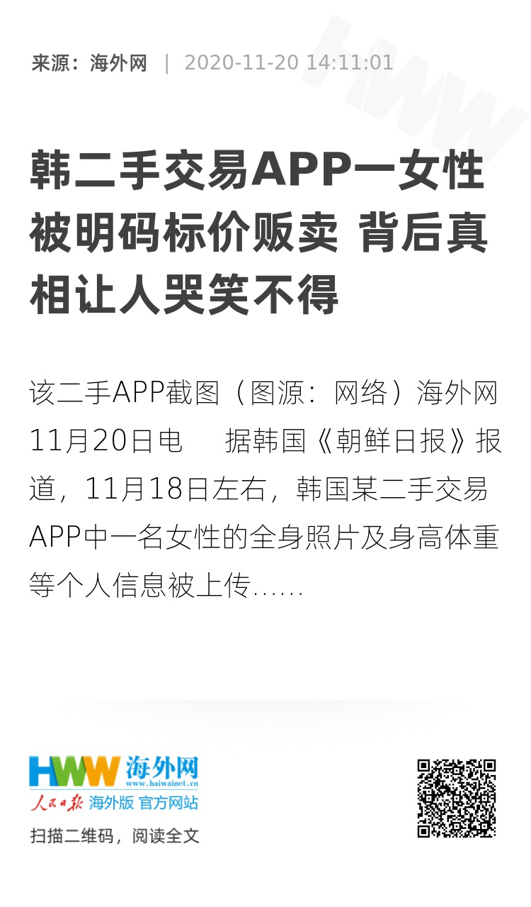 海外网11月20日电 据韩国《朝鲜日报》报道,11月18日左右,韩国某二手交易APP中一名女性的全身照片及身高体重等个人信息被上传到页面,并在下方注明了“因生计困难,所以决定贩卖自己”,“押金200万韩币,每月50万韩币”此类字样。该交易信息通过社交网络引起广泛关注。此后APP公司方面删除了该交易信息,并停用了该账号。
