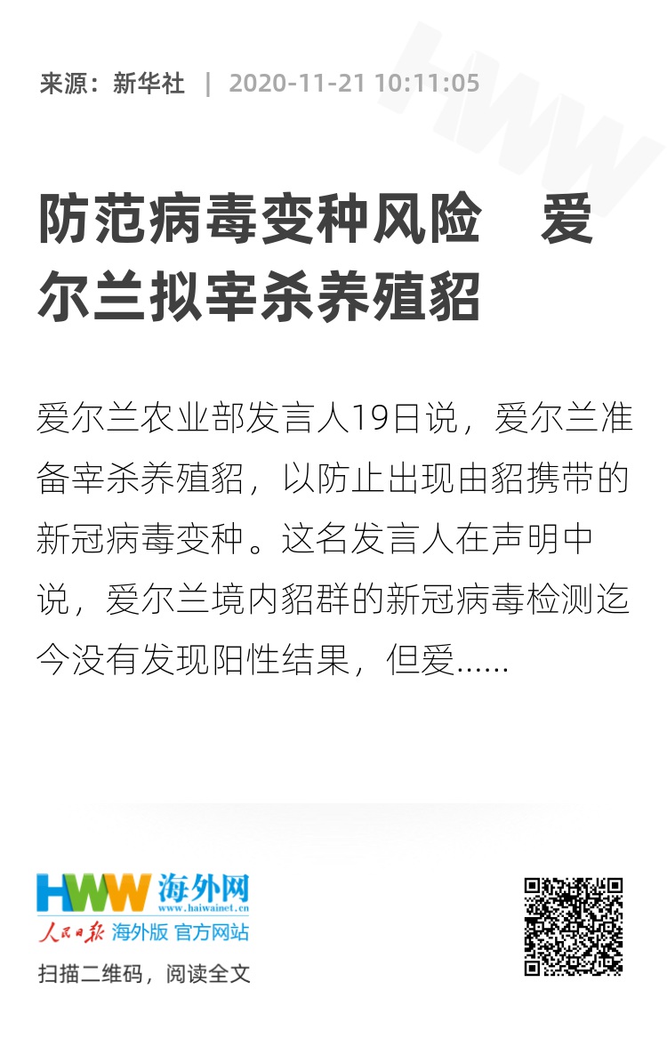 爱尔兰农业部发言人19日说,爱尔兰准备宰杀养殖貂,以防止出现由貂携带的新冠病毒变种。