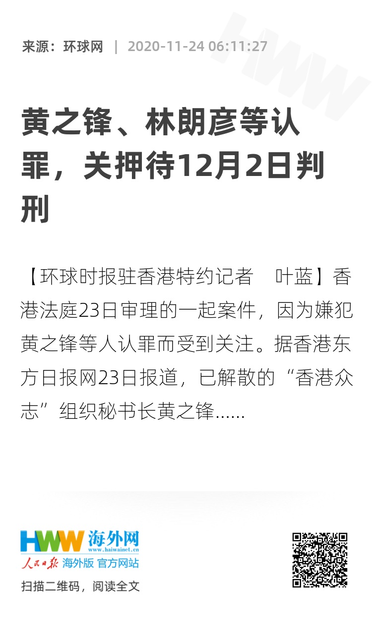 3人分别被控煽惑他人明知而参与未经批准的集结、组织未经批准的集结及明知而参与未经批准的集结罪。林朗彦和周庭承认所有控罪,黄之锋则否认一项明知而参与未经批准的集结罪,并获控方“不提证供起诉”,等于变相撤回一项控罪。他承认了其他两项控罪。黄之锋上庭前在与记者见面时称,3人将承认所有控罪,相信案件会跳过审讯阶段,直接进入结案陈词。法庭23日下令将他们还押至12月2日判刑,还押期间他们将在荔枝角收押所受看管。香港星岛日报网称,3名被告表现尚算平静。此前在今年8月5日,周庭已承认控罪,裁判官裁定她罪成,当时黄之锋与林朗彦并不认罪。有分析称,“认罪”并不代表3人承认“抗争行动有罪”,在主动认罪之下法庭会略过审讯阶段。而在原本的预期中,3人很有可能当庭就被判刑入狱(法官只有最高3年的监禁判决权)。据香港“01”网回顾,黄之锋去年因2014年占领旺角入狱两个月,并在去年6月本案发生前数天出狱。此前,黄之锋已经三度入狱。
