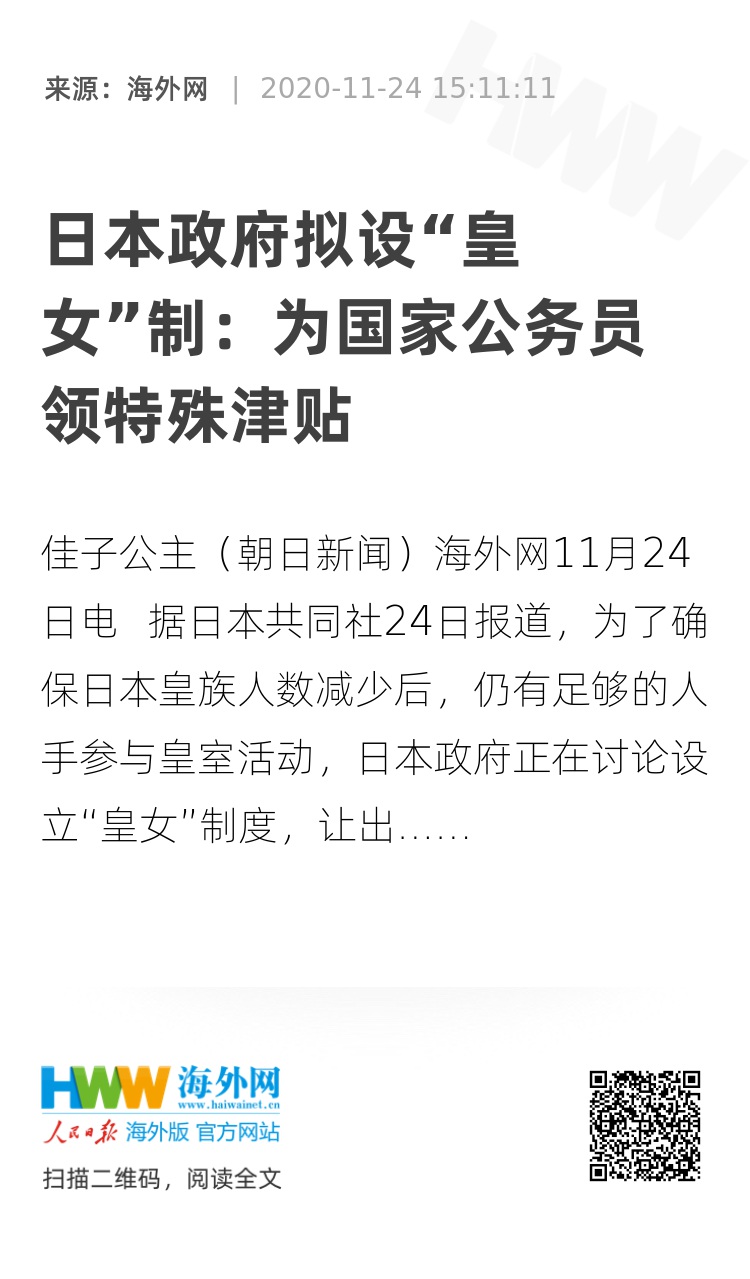 海外网11月24日电 据日本共同社24日报道,为了确保日本皇族人数减少后,仍有足够的人手参与皇室活动,日本政府正在讨论设立“皇女”制度,让出嫁后脱离皇籍的皇族女性以国家公务员身份继续参与公务。