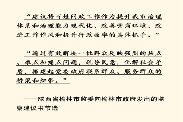 2019年12月6日,榆林市监委制发的《关于解决百姓问政工作中存在问题的建议》的监察建议书送达榆林市政府,并交于市长本人。