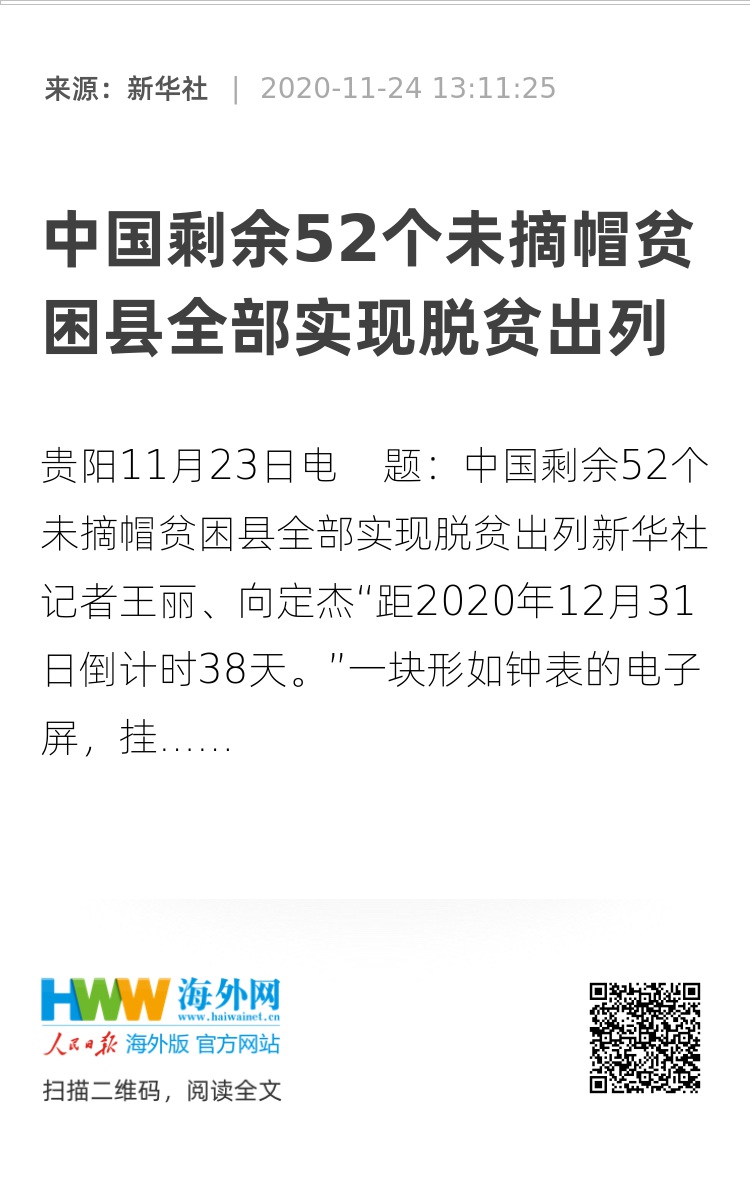 新华社贵阳11月23日电 题:中国剩余52个未摘帽贫困县全部实现脱贫出列