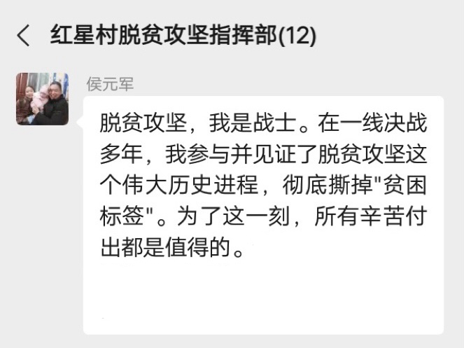 2016年开始,侯元军已连续驻村四年,先后在两个村担任第一书记。在红星村驻村期间,他以自己的名义从银行三次贷款共计26万元,为贫困户解决难题;为方便驻村帮扶,患有肾结石保守治疗、家庭也不富裕的他花2万元买了一辆二手皮卡车,不仅是自己的“通勤车”,也是村民的“运输车”。