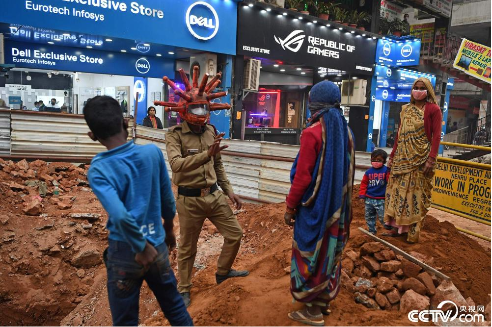 当地时间2020年11月25日,印度新德里,印度官员戴病毒头套,手举横幅,在街头呼吁民众提高防疫意识。 图片来源:人民视觉/央视网