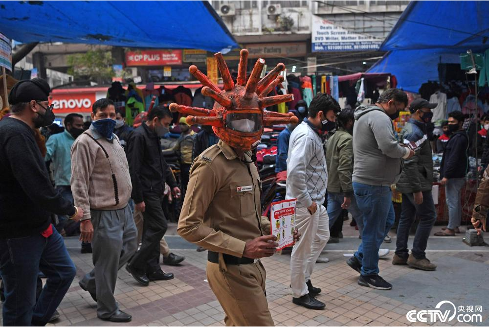 当地时间2020年11月25日,印度新德里,印度官员戴病毒头套,手举横幅,在街头呼吁民众提高防疫意识。 图片来源:人民视觉/央视网