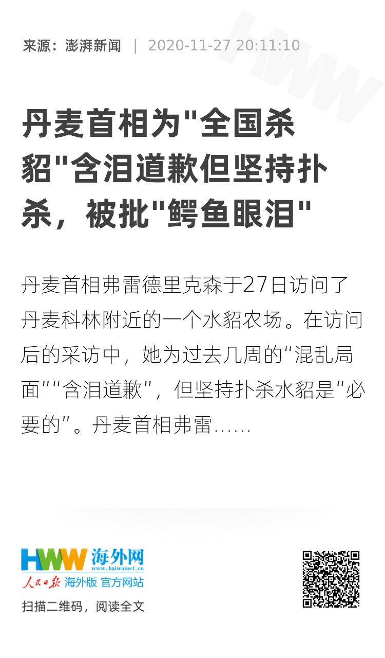 丹麦首相弗雷德里克森于27日访问了丹麦科林附近的一个水貂农场。在访问后的采访中,她为过去几周的“混乱局面”“含泪道歉”,但坚持扑杀水貂是“必要的”。