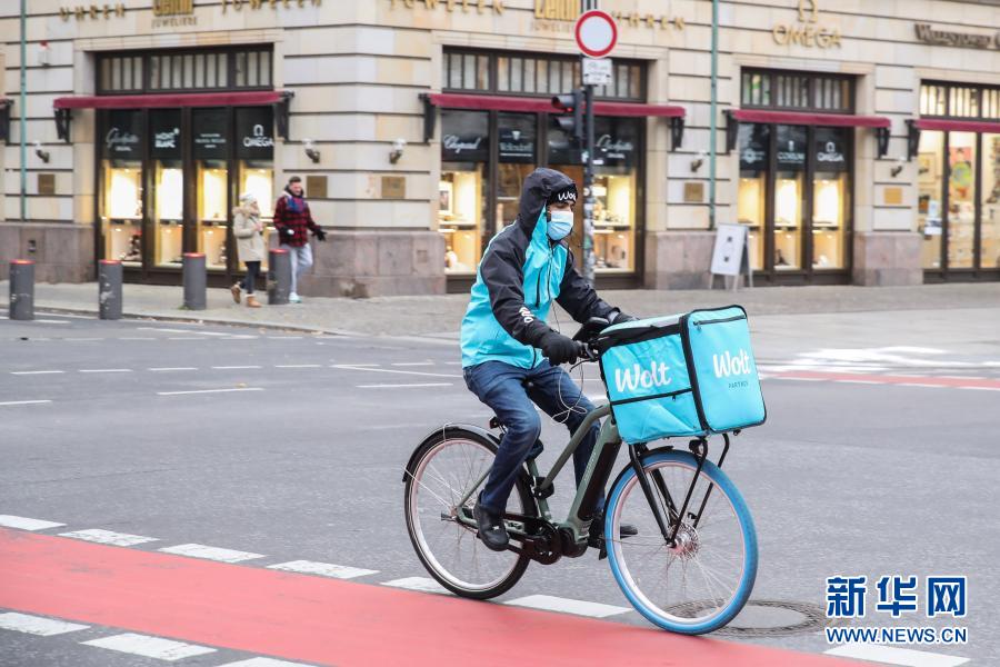 11月26日,在德国首都柏林,一名送餐员在街头骑行。德国联邦和各州政府25日晚达成协议,延长从11月初开始实施的新冠防疫限制措施至12月20日,并进一步收紧私人聚会人数限制、戴口罩等相关规定。新华社记者 单宇琦 摄