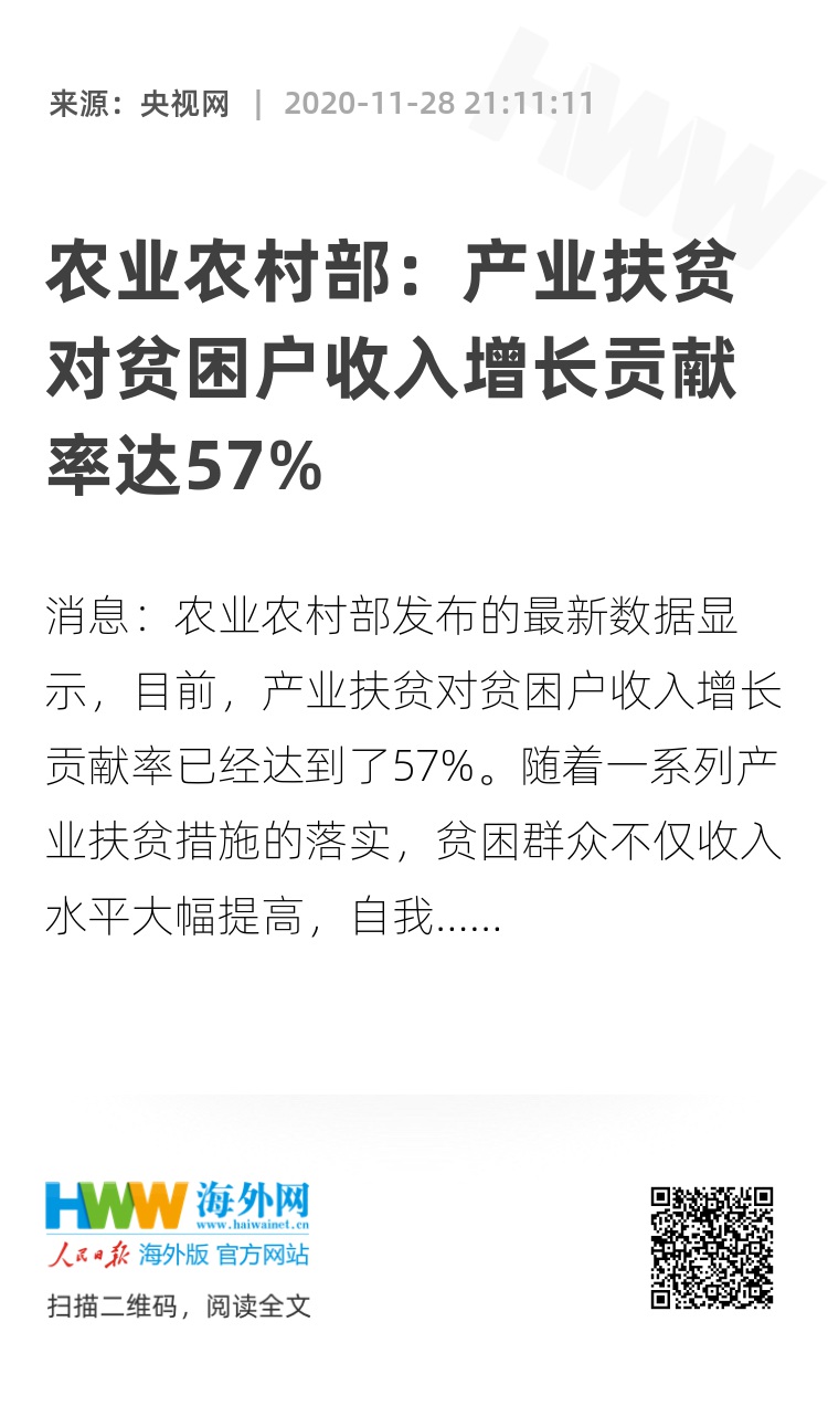 央视网消息:农业农村部发布的最新数据显示,目前,产业扶贫对贫困户收入增长贡献率已经达到了57%。随着一系列产业扶贫措施的落实,贫困群众不仅收入水平大幅提高,自我发展能力也明显提升。