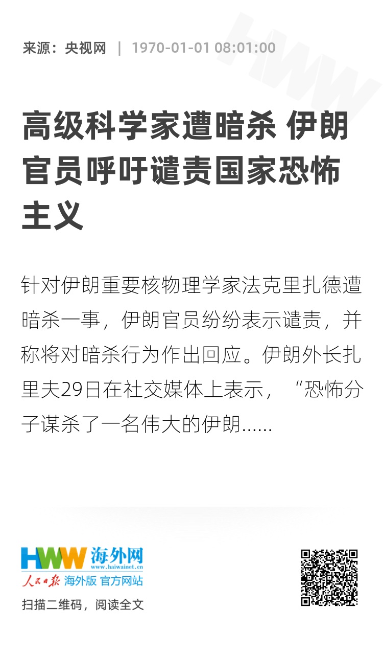 原标题:《伊朗官员谴责暗杀法克里扎德是国家恐怖主义》