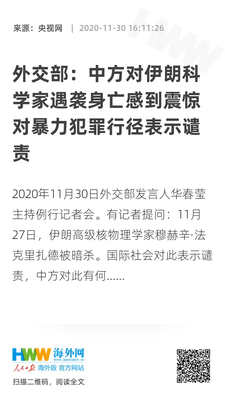 华春莹表示,中方对伊朗科学家遇袭身亡感到震惊,对这一暴力犯罪行径表示谴责,希望该事件得到彻查。中方反对任何加剧地区局势紧张,破坏地区和平稳定的行径。当前地区局势高度复杂敏感,各方应该共同致力于缓解地区紧张局势,维护地区的和平稳定。