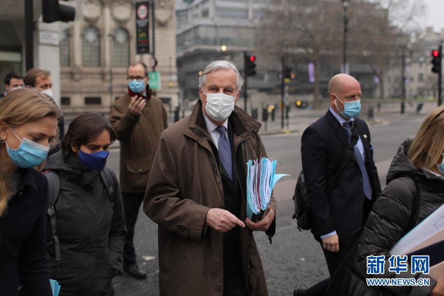 11月28日,在英国伦敦,欧盟首席谈判代表米歇尔·巴尼耶(中)前往与英方谈判的地点。当日,英欧未来关系谈判在伦敦重启面对面会谈。此前,因为欧方谈判团队一名成员新冠病毒检测呈阳性,新一轮英欧谈判不得不中断。新华社发(蒂姆·爱尔兰摄)