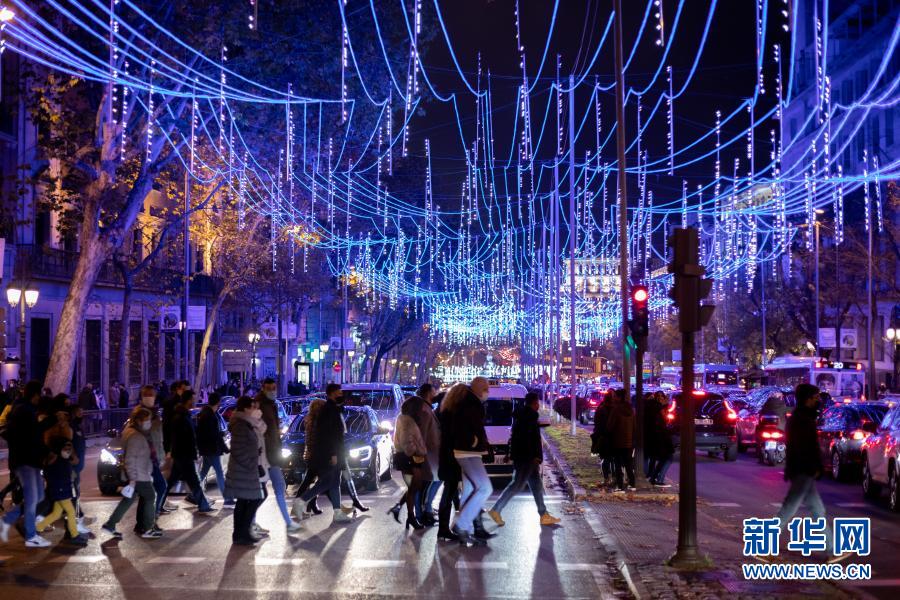 圣诞节将至,西班牙马德里市内的街道上悬挂起圣诞彩灯。新华社记者孟鼎博摄