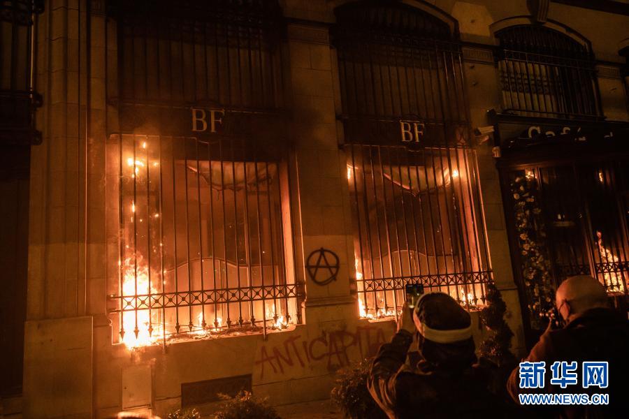 11月28日,法国巴黎巴士底广场附近的法兰西银行在游行示威中起火。法国包括巴黎在内的多个城市28日发生游行示威,反对涉执法人员法案有关条款和警察暴力执法。警方和示威者在部分游行地点发生冲突,至少46名示威者被逮捕。新华社发(奥雷利安·莫里萨尔摄)